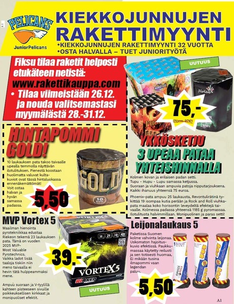 | 19.12.2025 14.27 | Kiekkojunnujen rakettimyynti 27.-31.12. |
